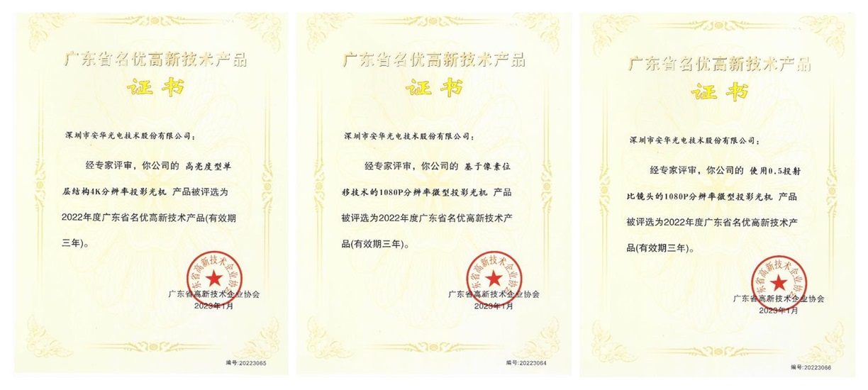 技術領先,創新不止。近日,廣東省高新技術企業協會公布了2022年廣東省名優高新技術產品名單,安華光電公司申報的“基于像素位移技術的1080P分辨率微型投影光機”、“高亮度型單層結構4K分辨率投影光機”、“使用0.5投射比鏡頭的1080P分辨率微型投影光機”3項優秀產品成功獲評。