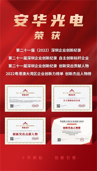 近日,第二十一屆(2022)深圳企業(yè)創(chuàng)新紀(jì)錄及2022粵港澳大灣區(qū)企業(yè)創(chuàng)新力榜單重磅發(fā)布,安華光電憑借著出色的創(chuàng)新能力,榮獲第二十一屆(2022)深圳企業(yè)創(chuàng)新紀(jì)錄“自主創(chuàng)新標(biāo)桿企業(yè)”獎(jiǎng)。