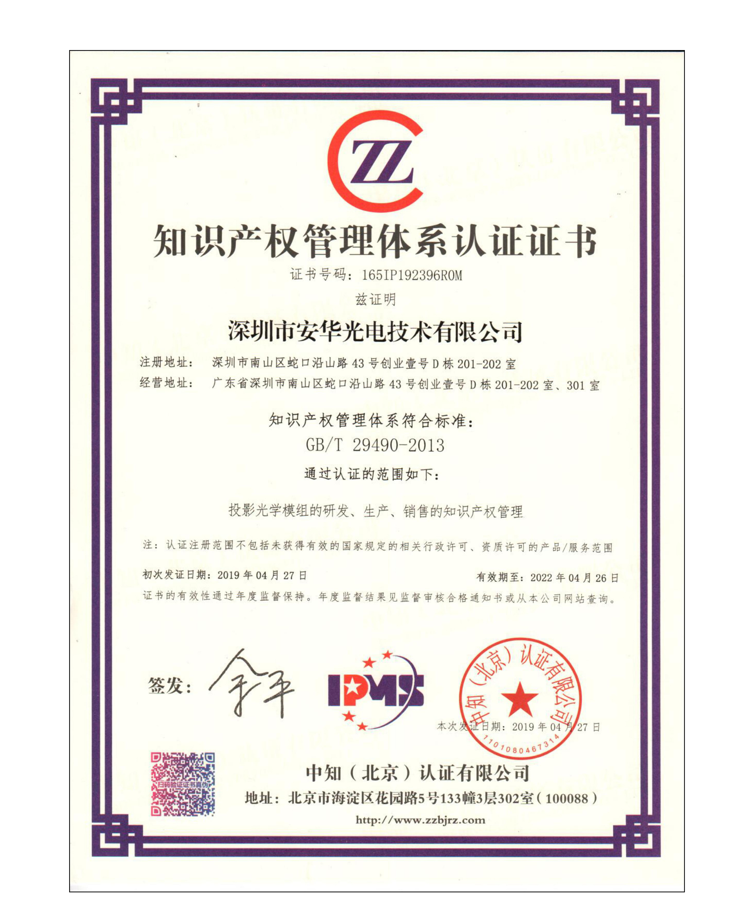 2019年4月27日,安華光電憑借其規范完善的知識產權管理,獲得由國內權威知識產權認證機構——中知(北京)認證有限公司所頒發的知識產權管理體系認證證書(證書編號:165IP192396R0M)。......