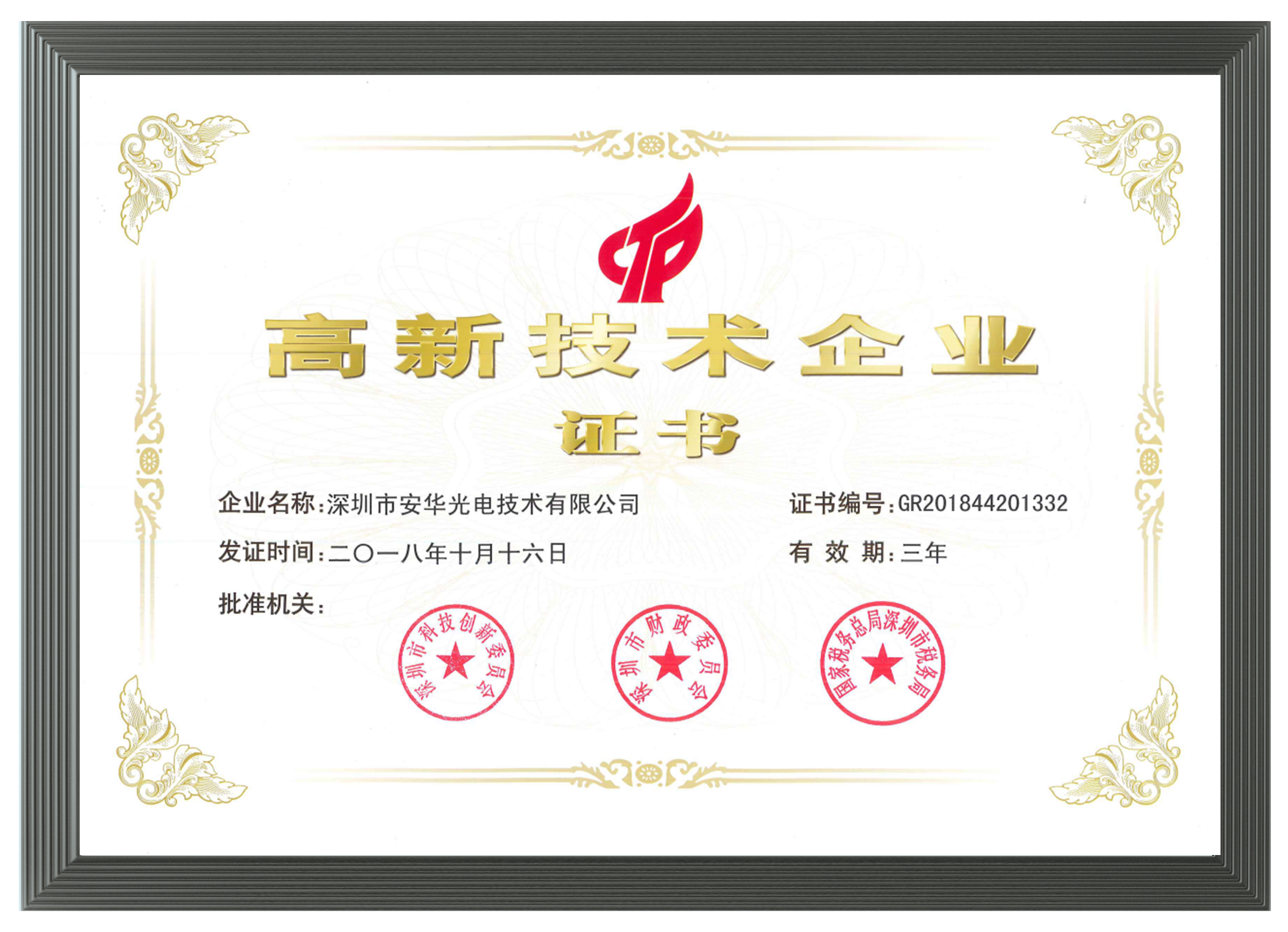 2018年10月,深圳市安華光電技術有限公司喜迎佳音,憑借專業的研發團隊,雄厚的技術實力,持續的成果轉化能力和嚴謹的組織管理水平,順利通過2018年第一批國家級高新技術企業認定。......